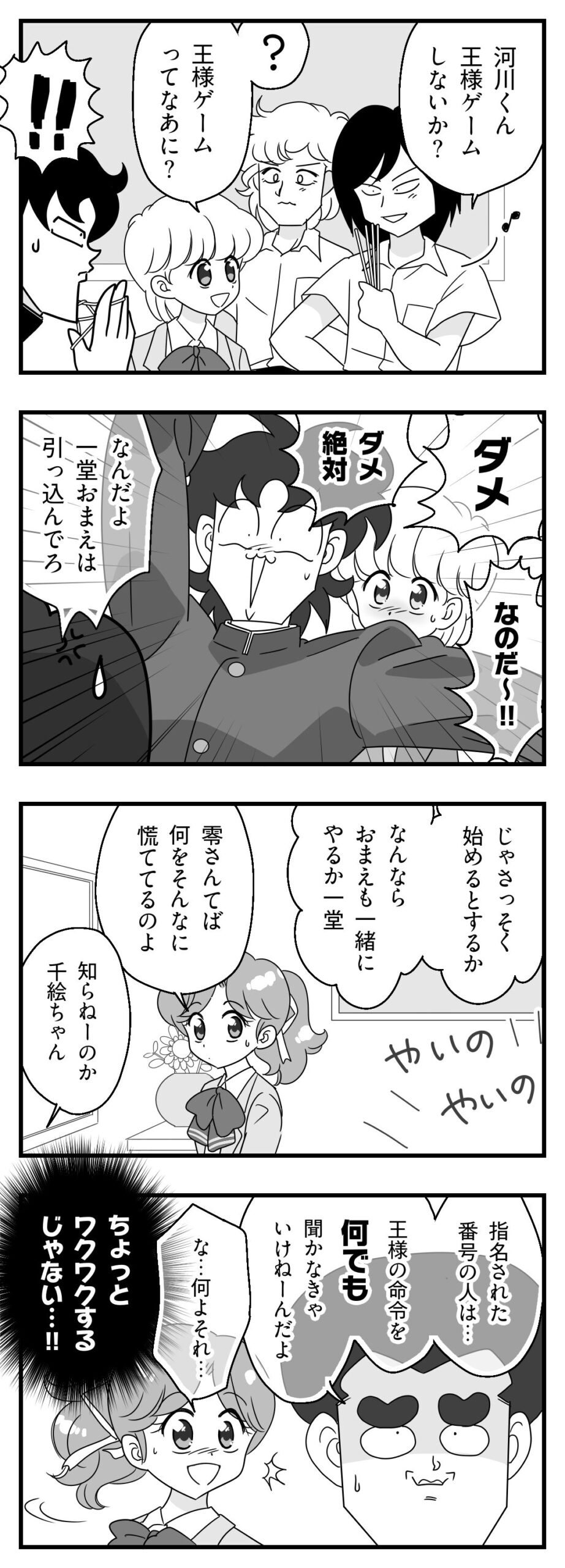 ホームハイスクール!奇面組零唯王様ゲーム①2026年4月18日SHAREポストシェアはてブLINEポストシェアはてブLINE お気に入りに追加私が小学生のころ、王様ゲームが流行ってたのを思い出して描いてみました。ドギツイ展開は期待しないでね笑 王様ゲーム② 王様ゲーム③タップで飛べるよ零唯豪千絵イラスト あわせて読みたい【ノイタミナカフェ】ハイスクール!奇面組コラボメニュー堪能してきたハイスクール!奇面組TOPへ同じカテゴリの人気記事1【イラスト】令和版10話「はい、あーん♡」2026年3月21日2令和版10話レッツゴー修学旅行「はい、あーん♡」2026年3月21日3零くんと豪くんのボーイズトーク2026年3月20日4零くん、メールに手こずる2026年3月17日5【イラスト】祝「ハイスクール!奇面組」再アニメ化2026年1月9日ハイスクール!奇面組TOPに戻るコメントを残す コメントをキャンセルメールアドレスが公開されることはありません。 ※ が付いている欄は必須項目ですコメント ※ 名前 ※ メール ※ サイト 次回のコメントで使用するためブラウザーに自分の名前、メールアドレス、サイトを保存する。上に表示された文字を入力してください。 Δ