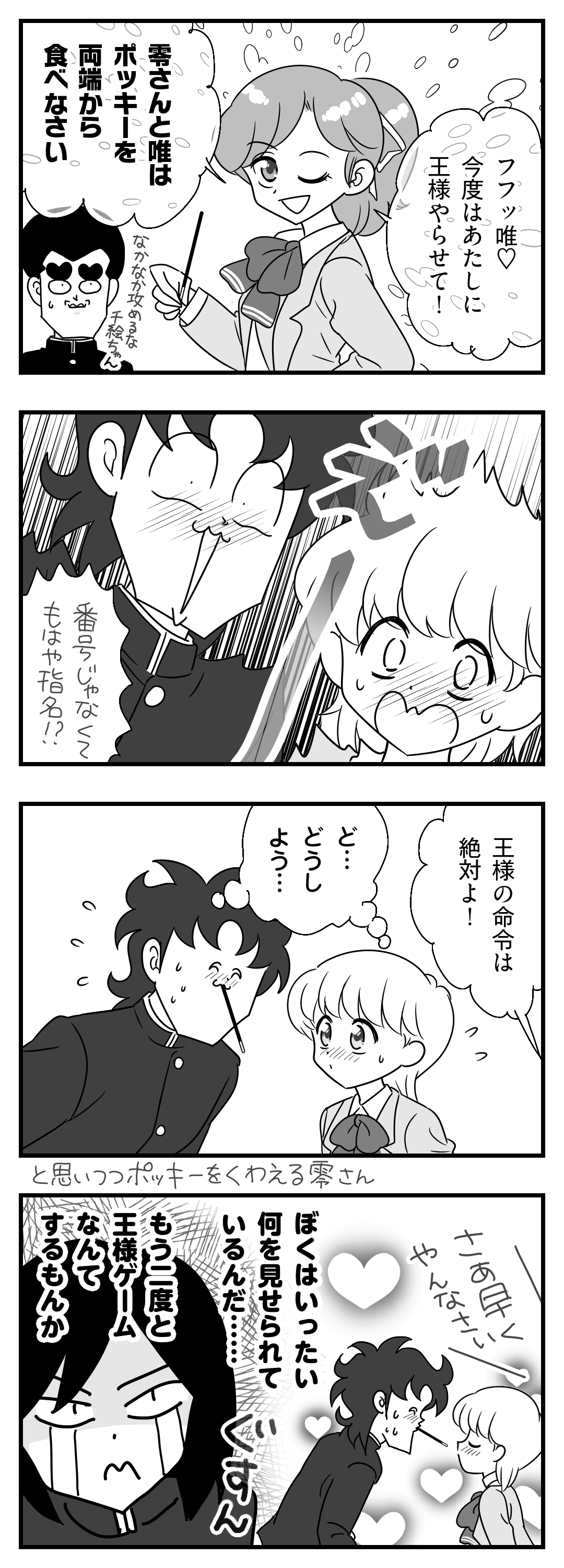 ホームハイスクール!奇面組零唯王様ゲーム④(終)2026年4月21日SHAREポストシェアはてブLINEポストシェアはてブLINE お気に入りに追加ポッキーゲーム、ぜひ零さんと唯ちゃんにやってもらいたい。アニメ2期でぜひお願いします♡真実くんめげるな、がんばれ! 2026年4月18日 王様ゲーム① 2026年4月18日 王様ゲーム② 2026年4月18日 王様ゲーム③ タップで飛べるよ零唯豪千絵イラスト あわせて読みたい【ノイタミナカフェ】ハイスクール!奇面組コラボメニュー堪能してきたハイスクール!奇面組TOPへ同じカテゴリの人気記事1【イラスト】令和版10話「はい、あーん♡」2026年3月21日2令和版10話レッツゴー修学旅行「はい、あーん♡」2026年3月21日3零くんと豪くんのボーイズトーク2026年3月20日4零さんにも「だ〜れだ?」してみた2026年3月20日5零くん、メールに手こずる2026年3月17日ハイスクール!奇面組TOPに戻るコメントを残す コメントをキャンセルメールアドレスが公開されることはありません。 ※ が付いている欄は必須項目ですコメント ※ 名前 ※ メール ※ サイト 次回のコメントで使用するためブラウザーに自分の名前、メールアドレス、サイトを保存する。上に表示された文字を入力してください。 Δ
